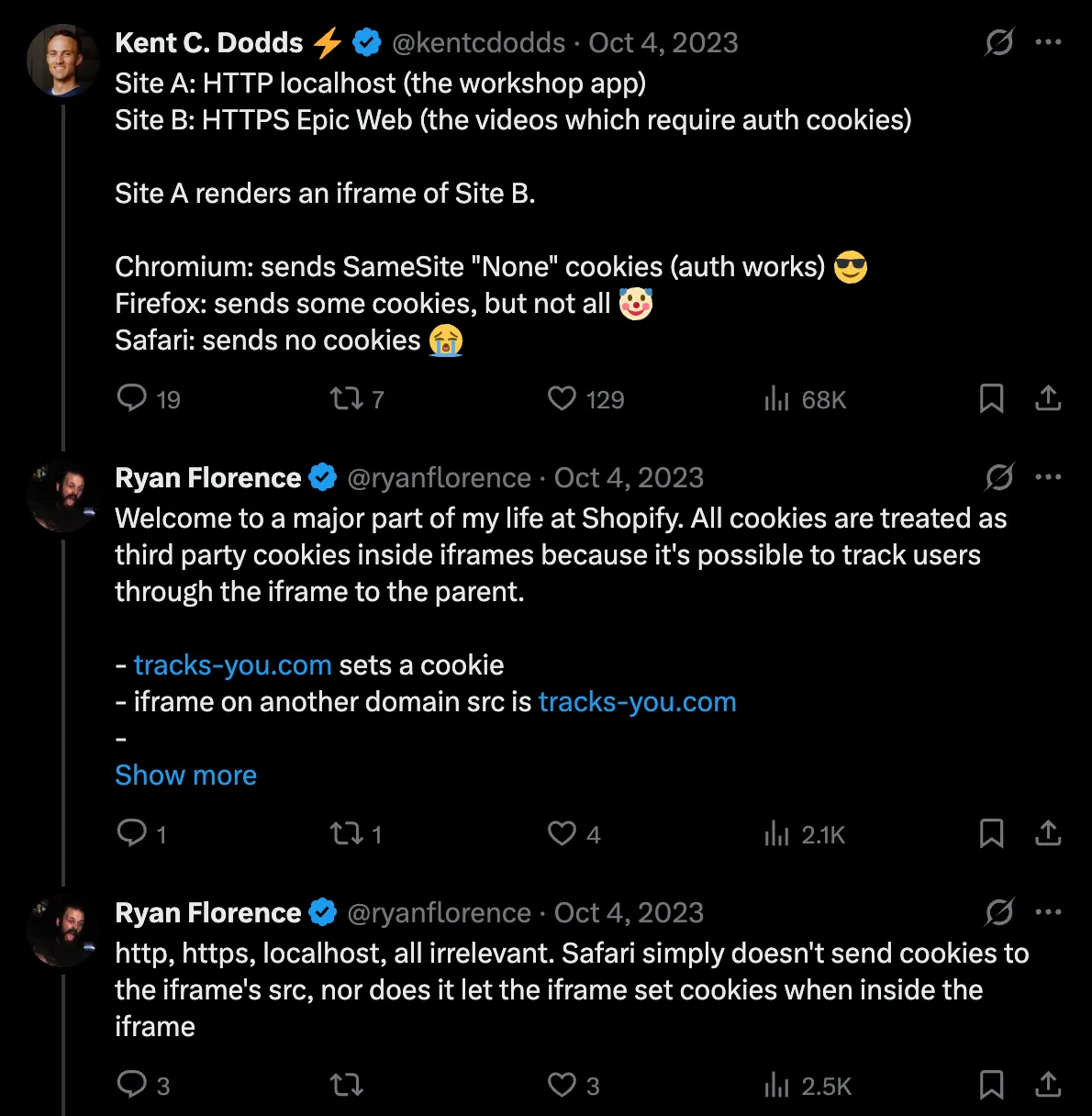 Our earlier architecture—a Jam-hosted recorder.jam.dev URL—can’t communicate directly with scripts on pages you host, because it’s a different origin. But what if we put an <iframe> on your pages from the same-origin as our recorder? Well, that’s not so simple. Here are @kentcdodds and @ryanflorence discussing the issue in Oct 2023: