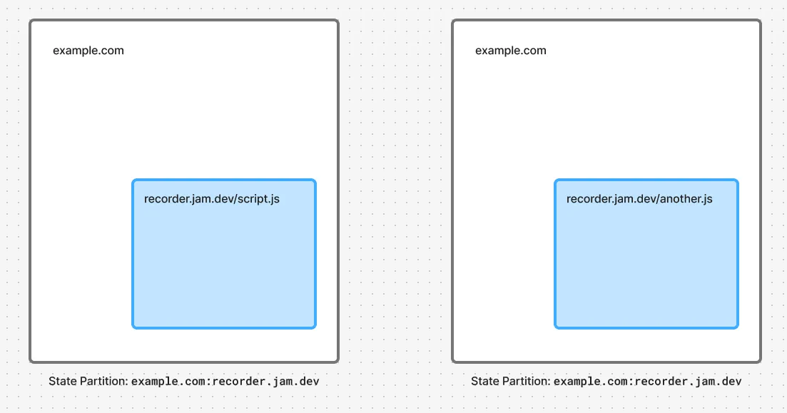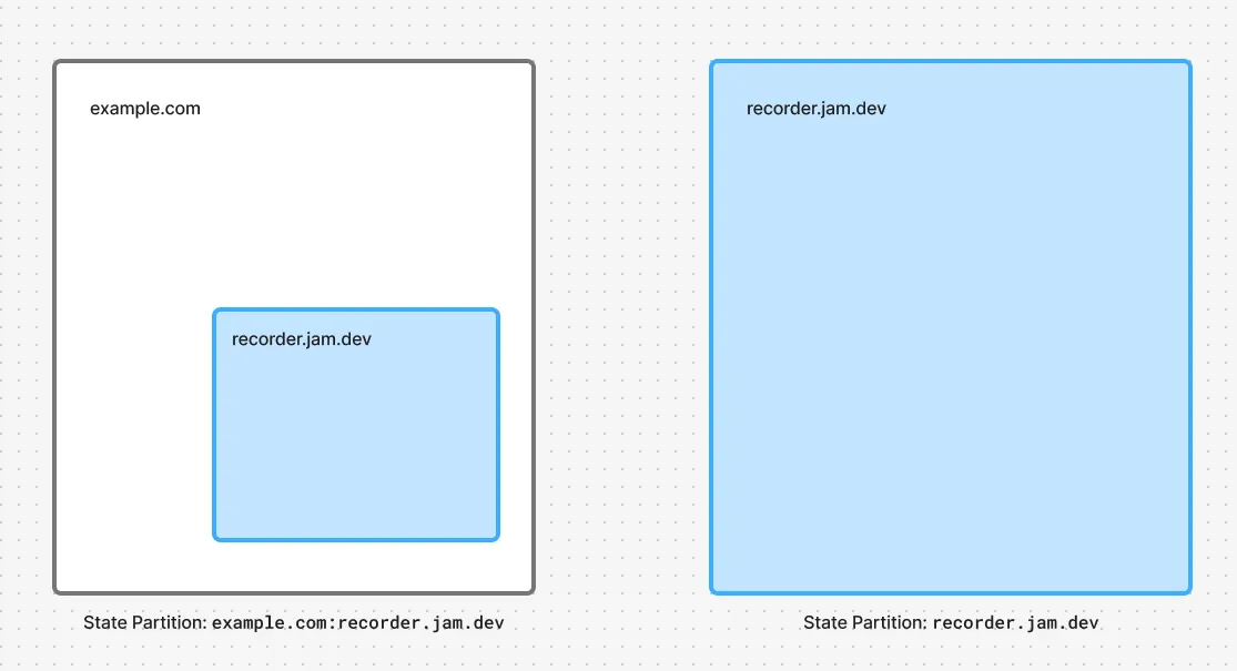 All browsers use a technique called “State Partitioning” to prevent cross-site tracking. What this means practically is that recorder.jam.dev frames embedded on example.com belong to a “state partition” keyed by the top-frame’s origin (i.e. example.com:recorder.jam.dev), whereas our top frame is in the top-level partition (i.e. recorder.jam.dev).