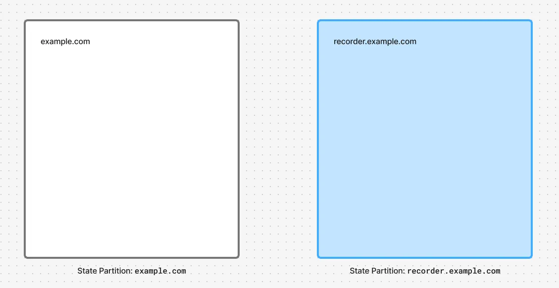 recorder.example.com is same-domain but not same-origin to example.comOur next idea was to bring our contents to your origin, by embedding both the Capture and the Recorder scripts onto your pages via iframe. This way, both capture.js and recorder.js scripts would live in the example.com:recorder.jam.dev partition, and could communicate to each other!